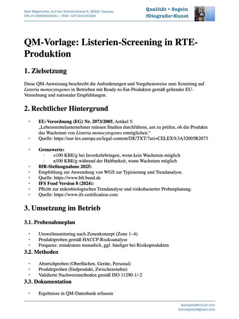 Diese QM-Anweisung beschreibt die Anforderungen und Vorgehensweise zum Screening auf Listeria monocytogenes in Betrieben mit Ready-to-Eat-Produkten gemäß geltender EU-Verordnung und nationaler Empfehlungen.